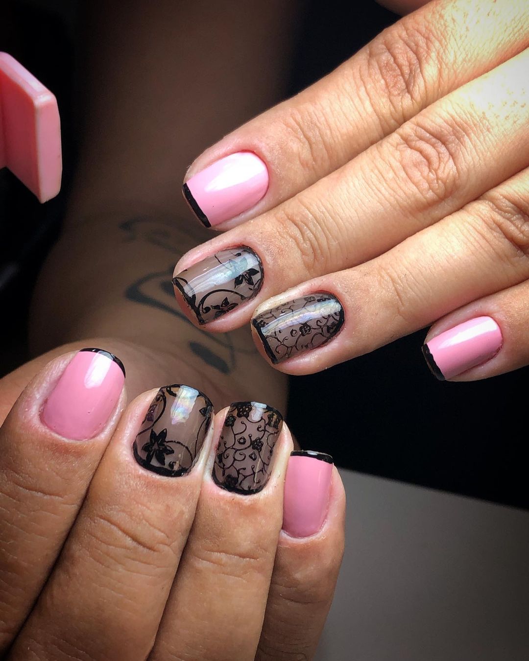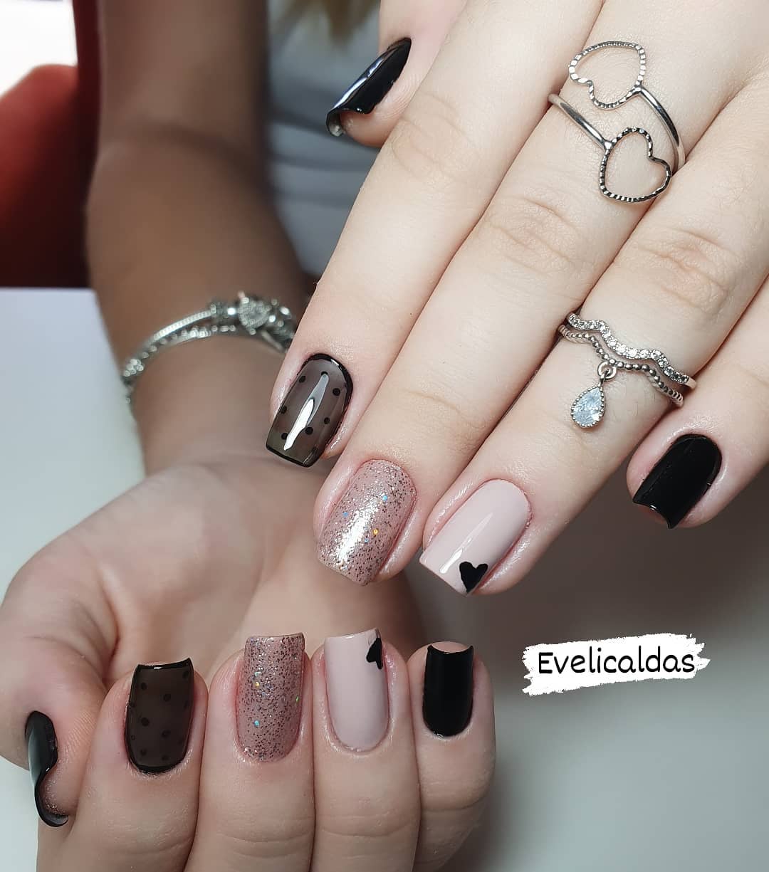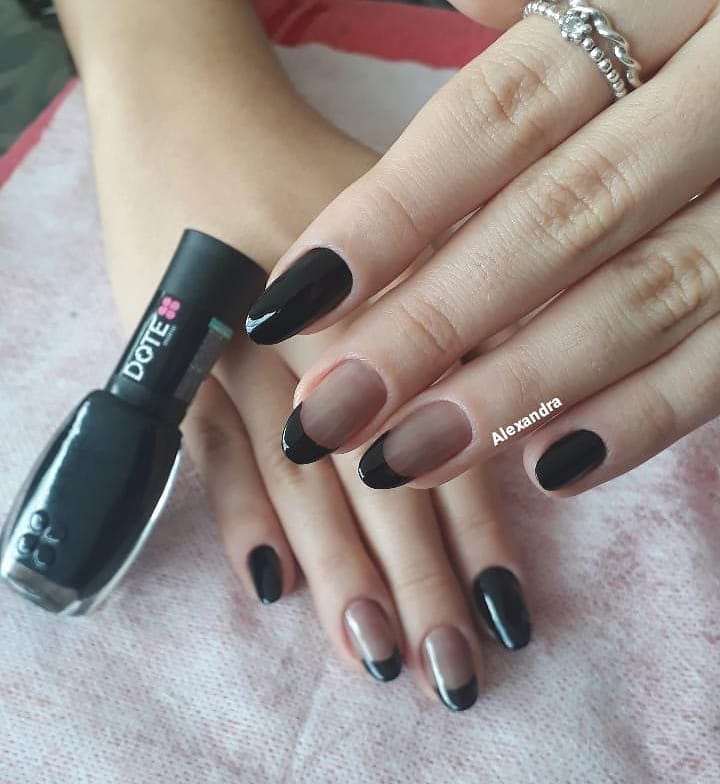 É basicamente a mistura de dois esmaltes. O primeiro é o transparente, ou , mais conhecido como base, com a junção do preto. Basta aplicar 2 gotinhas do esmalte preto dentro do frasco de base, agitar e aplicar 2 camadas nas unhas, e pronto, voce tem o efeito meia calça. O efeito fica parecido com um esmalte nude, só que com um toque bem sutil. Você pode aplicar uma base com glitter para finalizar.