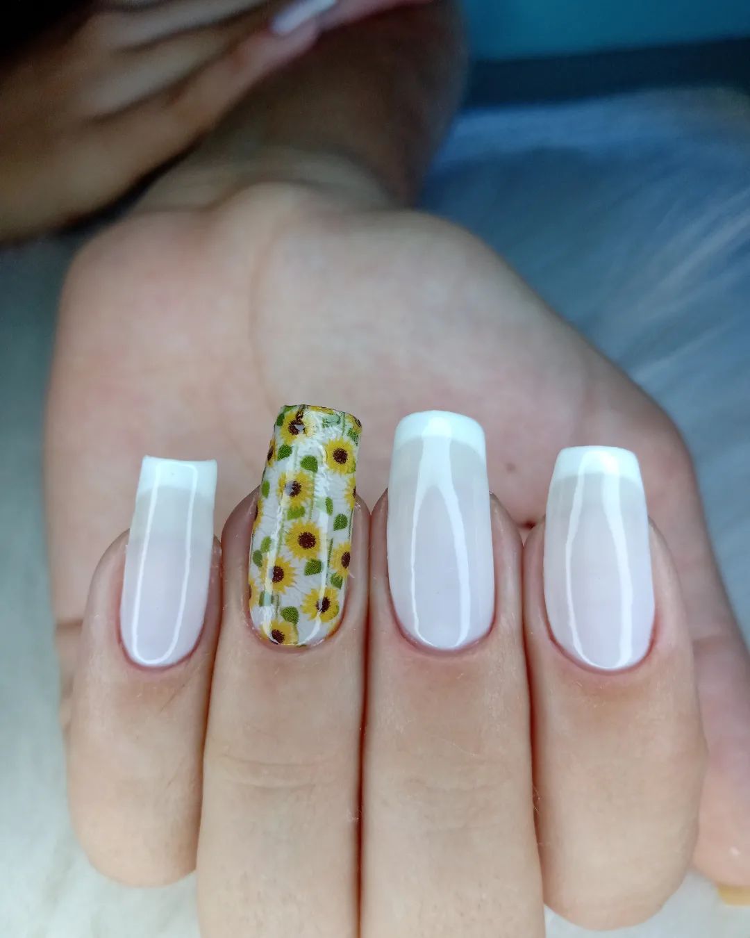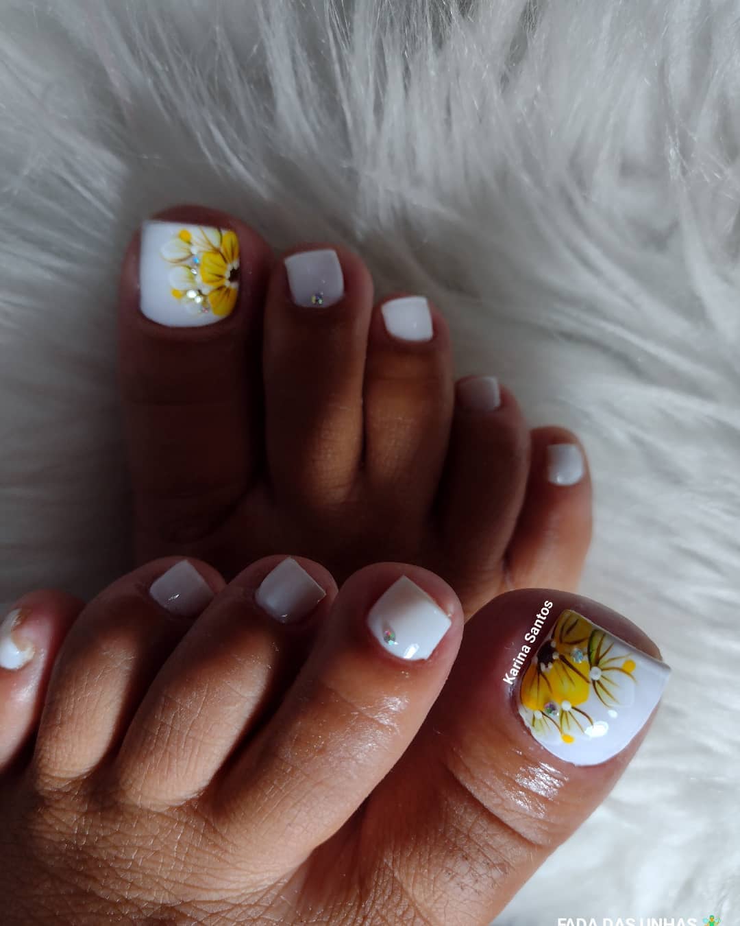 As unhas decoradas com flores nunca saem de moda tão cedo. A tecnologia muda, as estações vêm e vão, mas as unhas decoradas com flores estão sempre na moda. Verdadeiras na ponta dos dedos. Uma obra de arte! Girassoispodem ser decorados com tintas de tecido ou esmaltes de cores diferentes. Também é importante usar um pincel de tamanho 0 (o mais fino de todos os pincéis) para desenhar traços. Leva tempo e esforço, mas o resultado é incrível!